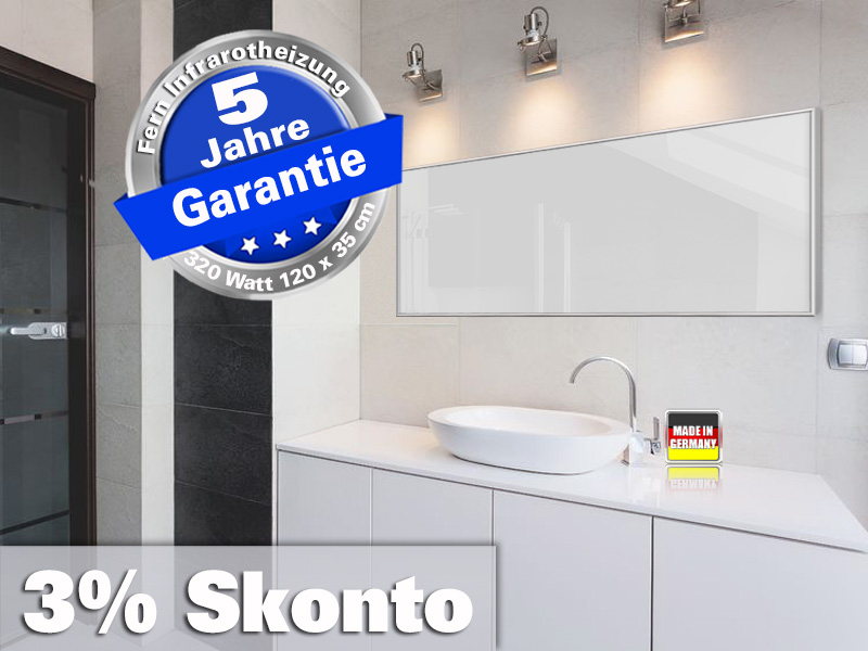 *Infrarot Spiegelheizungen mit Einscheiben Sicherheitsglas (ESG) können herstellungsbedingt (Sicherheits Eigenschaften) etwas dunkler erscheinen als herkömmliche Spiegel, es können auch Planitätsabweichungen auftreten. Dies ist kein Grund zur Reklamation